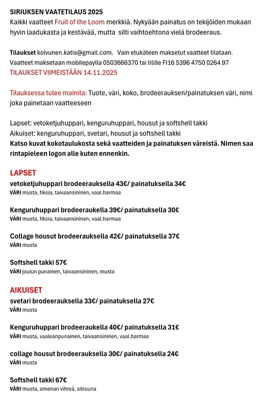 Tilaa Siriuksen logolla vaatteita 14.11. mennessä!